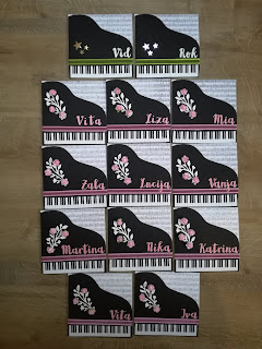 Prijateljica poučuje otroke igranja klavirja. Za vsakega izmed njih je naročila personalizirane voščilnice v obliki klavirja, ki jih bodo prejeli ob rojstnih dnevih.